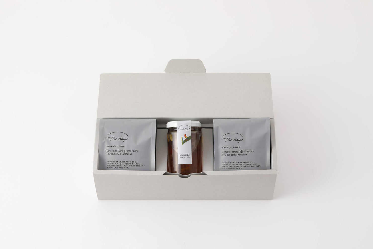 The daysのコーヒーは2種類の焙煎でお届けしています。どちらの焙煎も深めですが、微細な温度と時間の差で、2種類の焙煎を作っています。生豆本来の甘みや香りの華やかさをより感じていただける中深煎りと、奥行きや後味の長さと余韻を楽しんでいただける深煎り。それぞれどちらの美味しさも捨てがたく、このセットには2種類両方の焙煎を入れることにしました。ギフトボックス用の150gでパッケージしています。ご自宅でゆっくりドリップしたい方が直ぐに淹れていただけるように、粉の状態でご用意しました。焙煎したてのフレッシュの状態を楽しんでいただきたく、焙煎後直ぐに出荷できるよう心がけています。また、The days不動の人気の、スパイスが効いたレモネード、アジアンレモネードは、どなたに贈っても喜ばれる、美味しいはちみつを使ったオリジナルレモネードです。