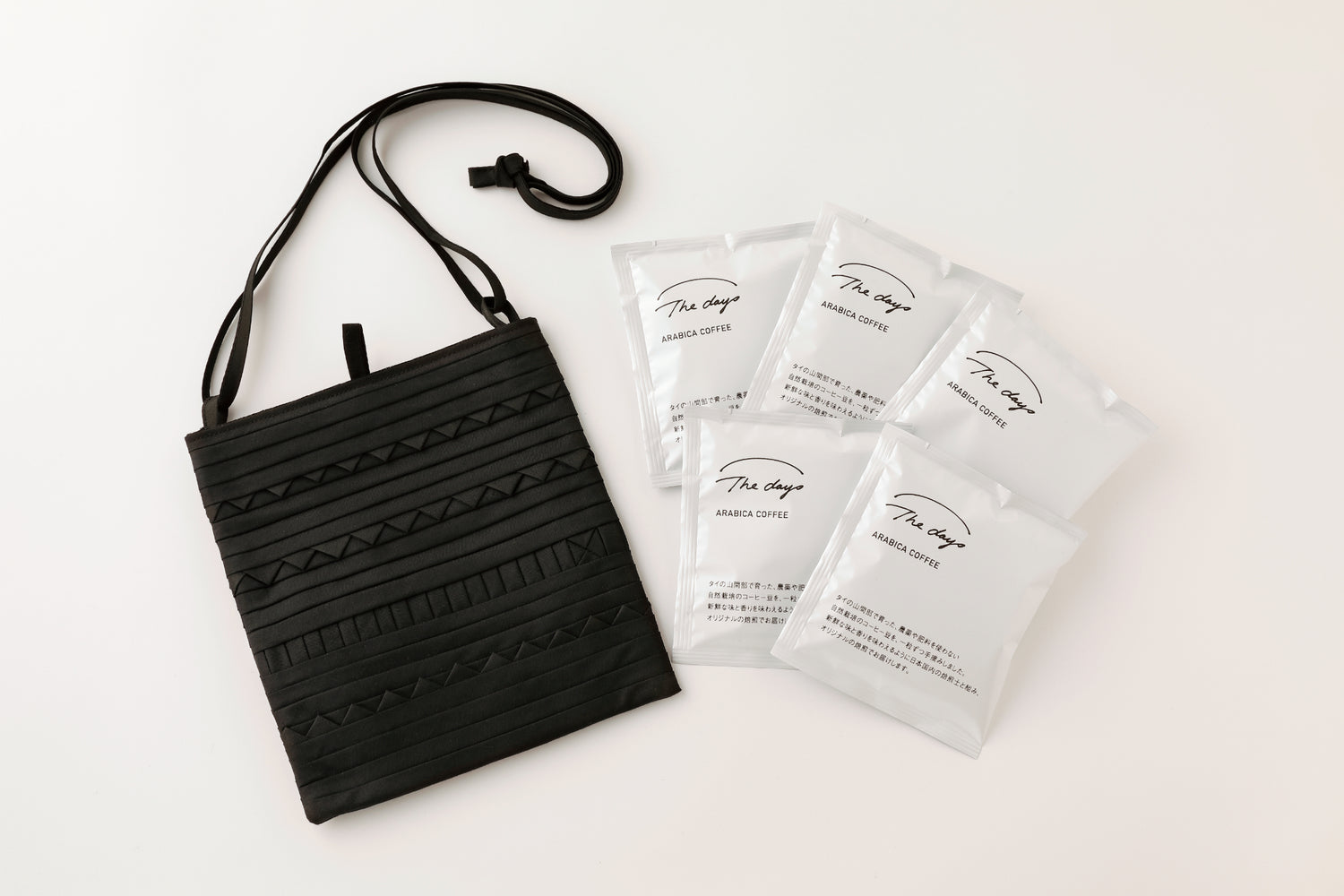 黒、グレー、白の3色の布を用いて、リス族の伝統的な工芸布の縫い方によってオリジナルのバッグを作っています。リス族は、タイ(北部)の山岳民族の中でもとても美意識が高く、色彩感覚の豊かな民族です。彼らが日常的に着用している民族衣装の色合いも、とてもカラフルです。もともと原色に近い鮮やかな色を使う、リス族の感覚にはそぐわないThe daysからの単色のオーダーに快く応えてくれて、実現した本バッグです。リス族の「リス」とは「高貴な人」という意味を持つそうです。プライドが高く競争心が強いという民族だそうで、オーダーした際に最初は「なぜシンプルな配色にするのかわからない」と言われました。世界中に技術を届けたい想いを伝え、理解してくださったリス族のみなさんが、毎日少しずつ縫ってくれています。(どのサコッシュのお色を選んでいただいても、中のドリップバッグは全てMedium Roasts となります)